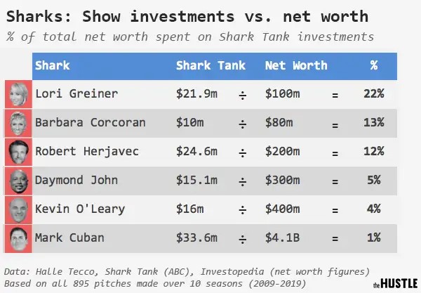 These deals lead to real money, and the investors benefit. In its first ten seasons, Shark Tank had “222 episodes, 895 pitches, 499 deals, $143.8m worth of invested capital, and nearly $1B in company valuations.” And as of 2023, the top eight successful products that received deals from Shark Tank investors earned a combined $1.2 billion in sales. The seven products that received deals during their episodes—Robert Herjavec invested in the Bouqs three years after the company appeared on Shark Tank—were offered an average of a $157,000 investment in exchange for an average stake of 18.9% in the company. (Not to mentioned that each Shark is paid approximately $50,000 per episode.)